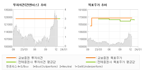 오늘 교보증권에서 발표된 'BUY'의견 및 목표주가 170,000원은 전체의견에 수렴하면서 시장의 평균적인 기대감이 비교적 객관적으로 표현된 것으로 풀이되며 목표가평균과 대비해서 미미한 차이가 나는 것으로 집계되었다.