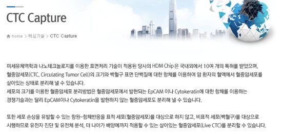 동사의 핵심 기술은 고밀도 미세공을 통한 CTC 분리검출로, CTC 유전자에 손상을 일으키지 않은 상태로 분리가 가능해 암 진단의 바이오마커로 활용되는 HER2, MET, PD-L1의 발현량 확인이 가능하다.