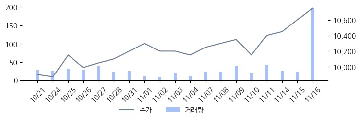 20일 평균 거래량 대비 거래량이 급증한 종목입니다. 최근 주가의 움직임과 주요 매매주체의 변동을 함께 확인해야 합니다. 11/16 15:00 기준