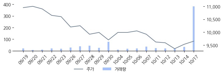 20일 평균 거래량 대비 거래량이 급증한 종목입니다. 최근 주가의 움직임과 주요 매매주체의 변동을 함께 확인해야 합니다. 10/17 15:35 기준