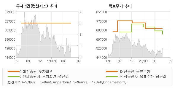 오늘 대신증권에서 발표된 'BUY(유지)'의견 및 목표주가 700,000원은 전체의견에 수렴하면서 시장의 평균적인 기대감이 비교적 객관적으로 표현된 것으로 풀이되며 목표가평균 대비 8% 초과하고 있는 것으로 집계되었다.