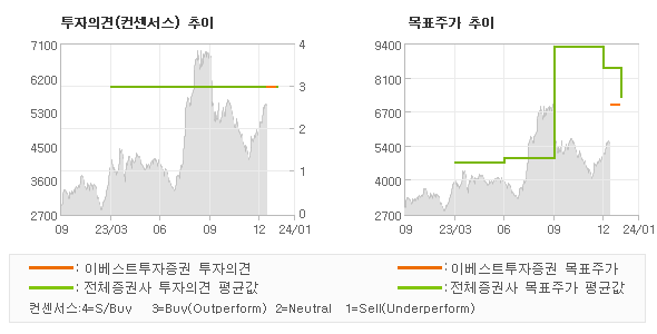 오늘 이베스트투자증권에서 발표된 'BUY(신규)'의견 및 목표주가 7,000원은 전체의견에 수렴하면서 시장의 평균적인 기대감이 비교적 객관적으로 표현된 것으로 풀이되며 목표가평균 대비 4.1%정도 미달하고 있는 것으로 집계되었다.
