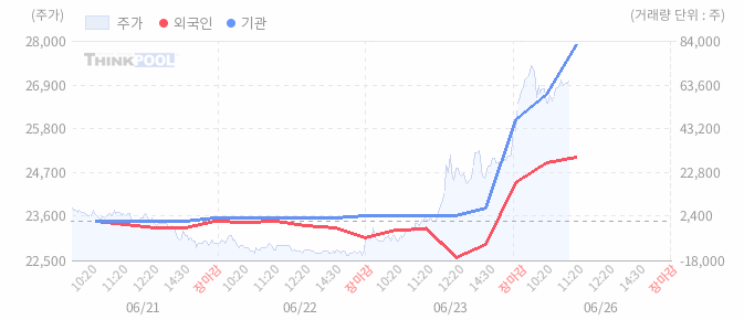 [투자주체 매매동향] 외국인·기관 순매수 전환…지수 반등 주도2023/06/26한미반도체 65억원(22만주), 18위 HD현대인프라코어 54억원(47만주), 19위 하이브 50억원(2만주)... 13위 네패스아크 29억원(11만주), 14위 에코앤드림 26억원(6만주), 15위 넥슨게임즈 26억원(11만주), 16위...