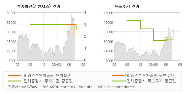 참고로 최근에 목표주가를 가장 공격적으로 제시한 하이투자증권은 투자의견 'BUY(유지)'에 목표주가 42,000원을 제일 보수적인 의견을 제시한 이베스트투자증권은 투자의견 'BUY(신규)'에 목표주가 32,000원을 제시한 바 있다.