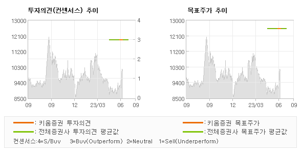 오늘 키움증권에서 발표된 'BUY'의견 및 목표주가 12,500원은 전체의견에 수렴하면서 시장의 평균적인 기대감이 비교적 객관적으로 표현된 것으로 풀이되며 목표가평균과 대비해서 미미한 차이가 나는 것으로 집계되었다. 참고로 최근 증권사 매매의견 중에서 제시한 바 있다.