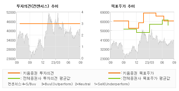 키움증권의 동종목에 대한 최근 1년동안의 투자의견은 전체적으로 큰 변화없이 유지되고 있다. 목표주가는 52,500원까지 내려갔다가 68,000원을 최고점으로 기록했었고 최근에는 60,000원선이 적정목표가로 제시되고 있다.