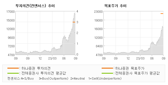 하나증권 박은정 애널리스트가 동종목에 대하여 이번에 제시한 'BUY(신규)'의견은 하나증권에서는 올해들어 처음 내놓는 매매의견이며 그리고 최근 분기내 발표된 전체 증권사 리포트의 컨센서스와 비교를 해볼 경우에 오늘 발표된 투자의견은 전체의견에 수렴하고 있어, 이번 의견은 시장의 평균적인 기대감이 객관적으로 표현된 것으로 분석되고 있다.