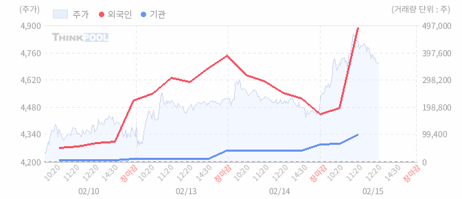 15일 11:10 매매 동향 : 외국인 324,521주 순매수, 기관 36,000주 순매수