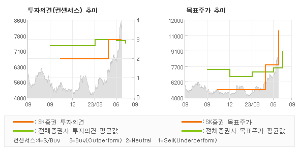 SK증권의 동종목에 대한 최근 9개월 동안의 투자의견은 전체적으로 상향조정되고 있다. 목표주가는 7,800원이 고점으로, 반대로 5,500원이 저점으로 제시된 이후 이번에 11,000수준으로 새롭게 조정되고 있다.