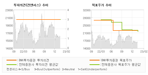 BNK투자증권의 동종목에 대한 최근 1년동안의 투자의견은 전체적으로 큰 변화없이 유지되고 있다. 목표주가는 2022년1월 27,000원까지 높아졌다가 2022년7월 22,000원을 최저점으로 목표가가 제시된 이후 최근에도 22,000원으로 제시되고 있다.