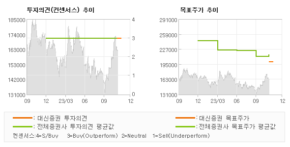 오늘 대신증권에서 발표된 'BUY(신규)'의견 및 목표주가 200,000원은 전체의견에 수렴하면서 시장의 평균적인 기대감이 비교적 객관적으로 표현된 것으로 풀이되며 목표가평균 대비 7%정도 미달하고 있는 것으로 집계되었다. 참고로 최근에 목표주가를 가장 공격적으로 제시한 한양증권은 투자의견 'BUY'에 목표주가 280,000원을 제일 보수적인 의견을 제시한 키움증권은 투자의견 'BUY'에 목표주가 190,000원을 제시한 바 있다.