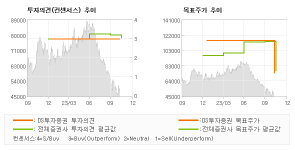 또한 DS투자증권에서 "투자의견 매수를 유지하고 목표주가는 최근 주가 하락에 따른 괴리율을 고려해 74,000원으로 하향. 2023년 연간 실적은 매출액 1.5조원(+10.9% YoY)과 영업이익 1,448억원(+243.9% YoY)으로 전망하며 전년 대비 뚜렷하게 개선된 실적이 예상.
