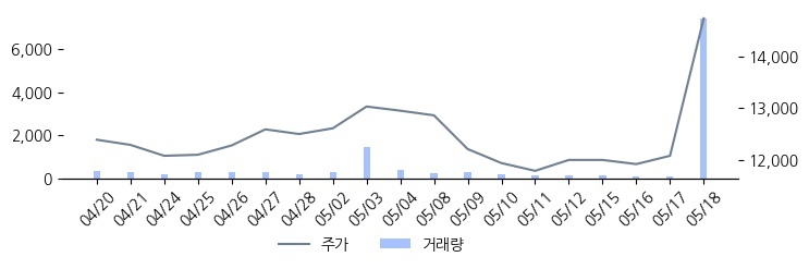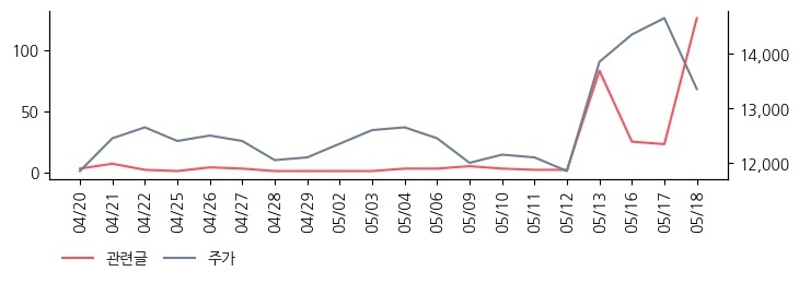 최근 20일 평균 대비 커뮤니티 및 SNS에 관련글이 급증한 종목입니다. 05/19 08:01 기준