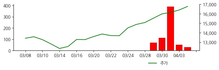 최근 연속적으로 상승 흐름을 보인 종목입니다. 상승강도에 따라서 조정을 보일 수도 있으니 주의를 기울일 타이밍입니다. 04/07 09:01 기준