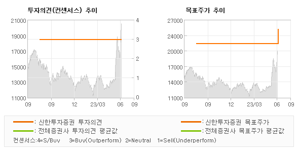 오늘 신한투자증권에서 발표된 'BUY'의견 및 목표주가 25,000원은 전체 컨센서스 대비해서 대체적으로 평균치에 해당하는 수준으로, 이번 의견은 동종목에 대한 전체적인 흐름에서 크게 벗어나지 않은 것으로 파악되며 목표가평균과 대비해서 미미한 차이가 나는 것으로 집계되었다. 참고로 최근 증권사 매매의견 중에서 제시한 바 있다.