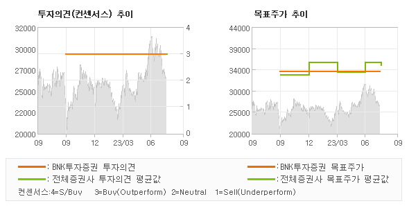 오늘 BNK투자증권에서 발표된 'BUY'의견 및 목표주가 34,000원은 전체의견에 수렴하면서 시장의 평균적인 기대감이 비교적 객관적으로 표현된 것으로 풀이되며 목표가평균 대비 8.7%정도 미달하고 있는 것으로 집계되었다.