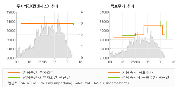 오늘 키움증권에서 발표된 'BUY'의견 및 목표주가 45,000원은 전체의견에 수렴하면서 시장의 평균적인 기대감이 비교적 객관적으로 표현된 것으로 풀이되며 목표가평균 대비 4.3%정도 미달하고 있는 것으로 집계되었다. 참고로 최근에 목표주가를 가장 공격적으로 제시한 한국투자증권은 투자의견 '매수(유지)'에 목표주가 63,000원을 제일 보수적인 의견을 제시한 IBK투자증권은 투자의견 'TRADING BUY'에 목표주가 35,000원을 제시한 바 있다.