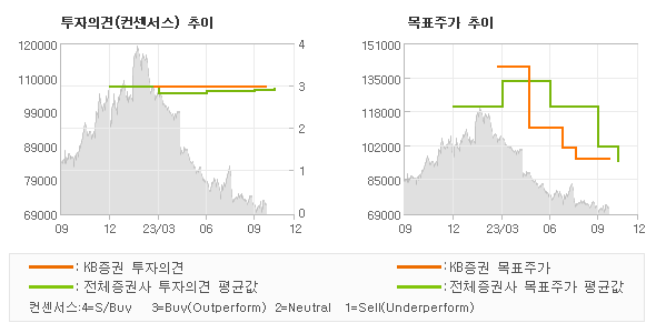 KB증권의 동종목에 대한 최근 3개월 동안의 투자의견은 전체적으로 큰 변화없이 유지되고 있다. 목표주가는 2023년3월 140,000원까지 높아졌다가 2023년8월 95,000원을 최저점으로 목표가가 제시된 이후 최근에도 95,000원으로 제시되고 있다.