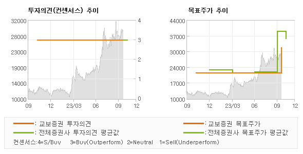 오늘 교보증권에서 발표된 'BUY'의견 및 목표주가 32,000원은 전체의견에 수렴하면서 시장의 평균적인 기대감이 비교적 객관적으로 표현된 것으로 풀이되며 목표가평균 대비 14.1%정도 미달하고 있는 것으로 집계되었다.