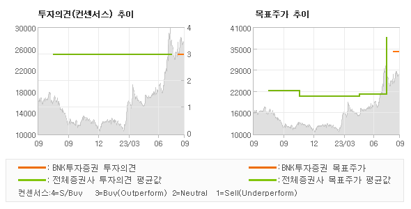 오늘 BNK투자증권에서 발표된 'BUY(신규)'의견 및 목표주가 34,000원은 전체의견에 수렴하면서 시장의 평균적인 기대감이 비교적 객관적으로 표현된 것으로 풀이되며 목표가평균 대비 8.1%정도 미달하고 있는 것으로 집계되었다. 참고로 최근에 목표주가를 가장 공격적으로 제시한 한국투자증권은 투자의견 '매수'에 목표주가 40,000원을 제시한 바 있다.