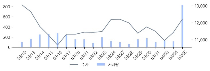 20일 평균 거래량 대비 거래량이 급증한 종목입니다. 최근 주가의 움직임과 주요 매매주체의 변동을 함께 확인해야 합니다. 04/05 14:00 기준
