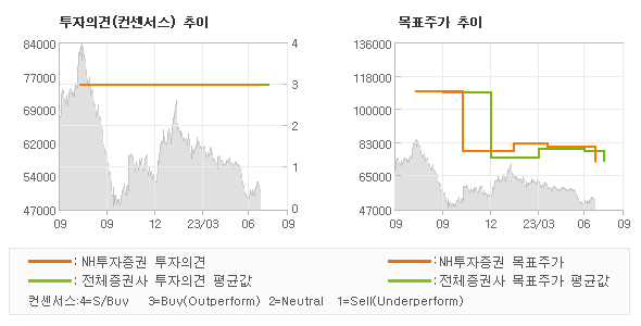 NH투자증권의 동종목에 대한 최근 1년동안의 투자의견은 전체적으로 큰 변화없이 유지되고 있다. 목표주가는 2022년6월 110,000원까지 높아졌다가 2022년11월 78,000원을 최저점으로 목표가가 제시된 이후 최근에 72,000원으로 새롭게 조정되고 있다.