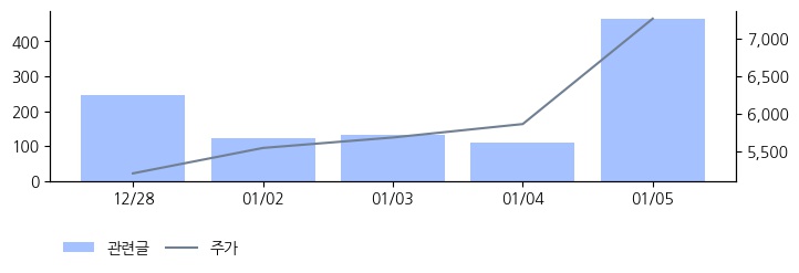 최근 5일 평균 대비 커뮤니티 및 SNS에 관련글이 급증한 종목입니다. 01/08 08:01 기준
