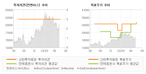 오늘 신한투자증권에서 발표된 '매수(유지)'의견 및 목표주가 30,000원은 전체의견에 수렴하면서 시장의 평균적인 기대감이 비교적 객관적으로 표현된 것으로 풀이되며 목표가평균 대비 2.4%정도 미달하고 있는 것으로 집계되었다.