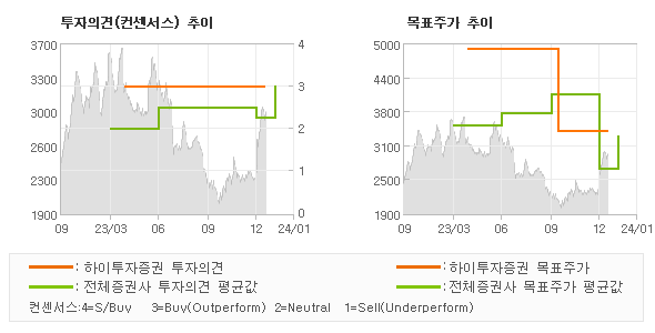 하이투자증권의 동종목에 대한 최근 9개월 동안의 투자의견은 전체적으로 큰 변화없이 유지되고 있다. 목표주가는 2023년4월 4,900원까지 높아졌다가 2023년10월 3,400원을 최저점으로 목표가가 제시된 이후 최근에도 3,400원으로 제시되고 있다.