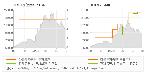 오늘 다올투자증권에서 발표된 'BUY'의견 및 목표주가 180,000원은 전체의견에 수렴하면서 시장의 평균적인 기대감이 비교적 객관적으로 표현된 것으로 풀이되며 목표가평균과 대비해서 미미한 차이가 나는 것으로 집계되었다.