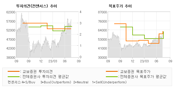 오늘 교보증권에서 발표된 'TRADING BUY'의견 및 목표주가 62,000원은 전체의견에 수렴하면서 시장의 평균적인 기대감이 비교적 객관적으로 표현된 것으로 풀이되며 목표가평균 대비 2.4% 초과하고 있는 것으로 집계되었다.