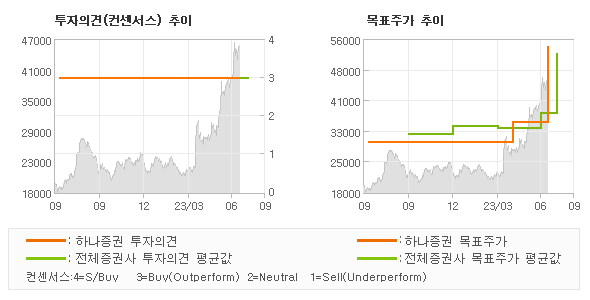 오늘 하나증권에서 발표된 'BUY'의견 및 목표주가 54,000원은 전체의견에 수렴하면서 시장의 평균적인 기대감이 비교적 객관적으로 표현된 것으로 풀이되며 목표가평균 대비 21.8% 초과하고 있는 것으로 집계되었다. 참고로 최근에 목표주가를 가장 공격적으로 제시한 흥국증권은 투자의견 'BUY'에 목표주가 55,000원을 제일 보수적인 의견을 제시한 유진투자증권은 투자의견 'BUY'에 목표주가 36,000원을 제시한 바 있다.