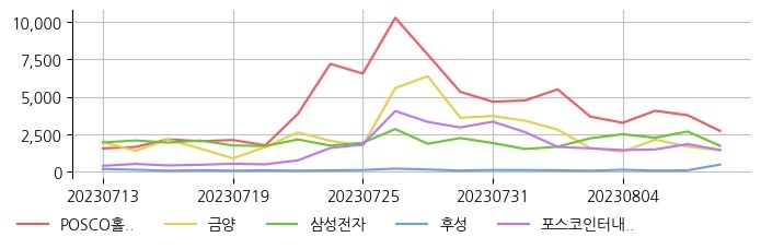 ?▲포스코홀딩스(보합), 포스코엠텍(하락), 포스코DX(하락), 포스코퓨처엠(상승), 포스코인터내셔널... 2차전지 소재 분야에서 포스코 그룹의 리튬, 니켈 등 원료, 이차전지소재 연구센터 등 R&D 인프라, 글로벌...