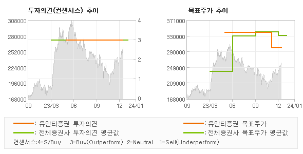 유안타증권의 동종목에 대한 최근 9개월 동안의 투자의견은 전체적으로 큰 변화없이 유지되고 있다. 목표주가는 2023년5월 340,000원까지 높아졌다가 2023년11월 300,000원을 최저점으로 목표가가 제시된 이후 최근에도 300,000원으로 제시되고 있다.
