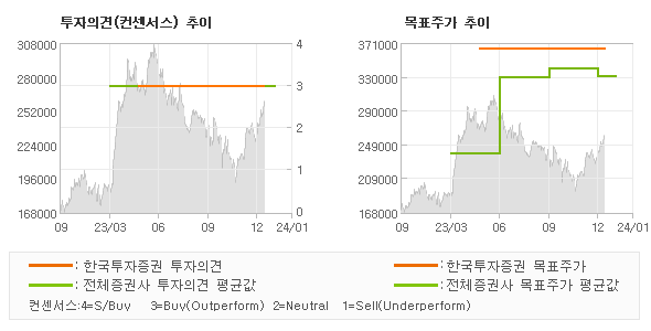 한국투자증권의 동종목에 대한 최근 9개월 동안의 투자의견은 전체적으로 큰 변화없이 유지되고 있다. 목표주가는 2022년12월 230,000원이 저점으로 제시된 이후 이번에 발표된 365,000원까지 꾸준하게 상향조정되어 왔다.