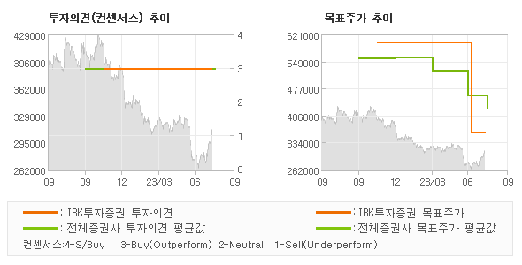 오늘 IBK투자증권에서 발표된 'BUY'의견 및 목표주가 360,000원은 전체의견에 수렴하면서 시장의 평균적인 기대감이 비교적 객관적으로 표현된 것으로 풀이되며 목표가평균 대비 14.7%정도 미달하고 있는 것으로 집계되었다. 참고로 최근에 목표주가를 가장 공격적으로 제시한 하나증권은 투자의견 'BUY'에 목표주가 480,000원을 제시한 바 있다.