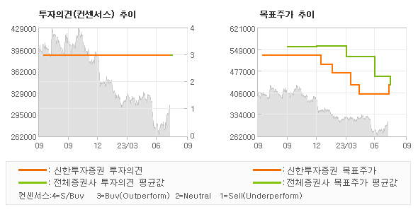 목표주가는 2022년11월 600,000원까지 높아졌다가 2023년7월 360,000원을 최저점으로 목표가가 제시된 이후 최근에도 360,000원으로 제시되고 있다.