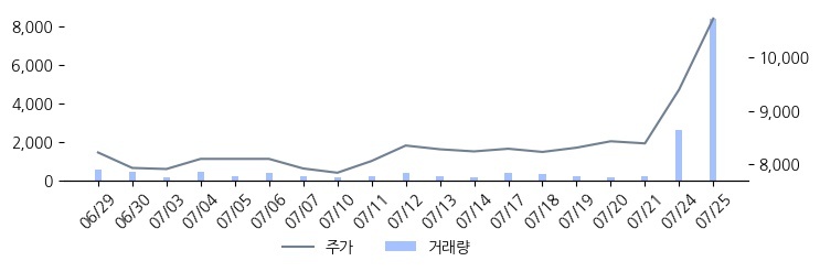 20일 평균 거래량 대비 거래량이 급증한 종목입니다. 최근 주가의 움직임과 주요 매매주체의 변동을 함께 확인해야 합니다. 07/25 15:39 기준