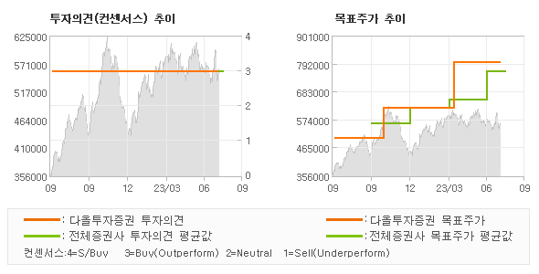 오늘 다올투자증권에서 발표된 'BUY'의견 및 목표주가 800,000원은 전체 컨센서스 대비해서 대체적으로 평균치에 해당하는 수준으로, 이번 의견은 동종목에 대한 전체적인 흐름에서 크게 벗어나지 않은 것으로 파악되며 목표가평균 대비 5.9% 초과하고 있는 것으로 집계되었다.