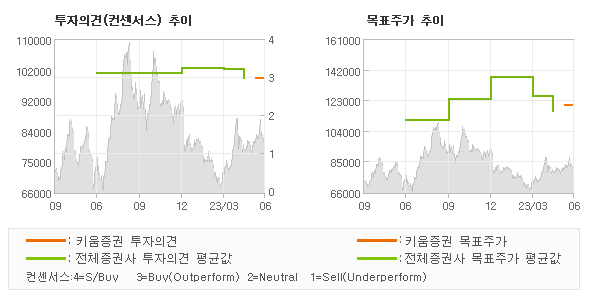 참고로 최근에 목표주가를 가장 공격적으로 제시한 신한투자증권은 투자의견 'BUY(유지)'에 목표주가 130,000원을 제일 보수적인 의견을 제시한 KB증권은 투자의견 'BUY(신규)'에 목표주가 95,000원을 제시한 바 있다.