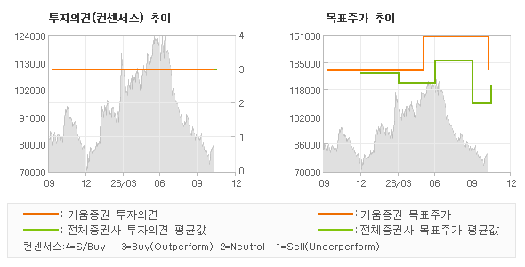 키움증권의 동종목에 대한 최근 1년동안의 투자의견은 전체적으로 큰 변화없이 유지되고 있다. 목표주가는 한때 2023년5월 150,000원을 최고점으로 기록된 이후 최근에 130,000원 수준까지 다소 하향조정되고 있다.