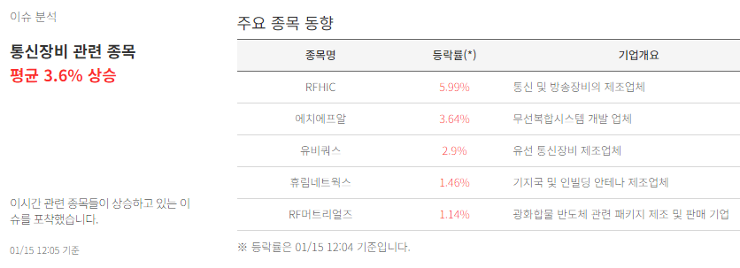 15위 RFHIC 주가, 16위 중앙첨단소재 주가, 17위 인성정보 주가, 18위 코맥스 주가, 19위 코콤 주가, 20위는 아이크래프트 주가 순으로 나타났다. [출처: 랭키파이 업종별 주식 통신장비 부문 트렌드 테이블]...