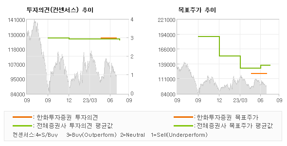 오늘 한화투자증권에서 발표된 'BUY'의견 및 목표주가 120,000원은 전체의견에 수렴하면서 시장의 평균적인 기대감이 비교적 객관적으로 표현된 것으로 풀이되며 목표가평균 대비 9.6%정도 미달하고 있는 것으로 집계되었다. 참고로 최근에 목표주가를 가장 공격적으로 제시한 흥국증권은 투자의견 'BUY'에 목표주가 150,000원을 제일 보수적인 의견을 제시한 유안타증권은 투자의견 'HOLD'에 목표주가 100,000원을 제시한 바 있다.