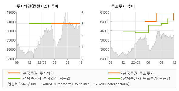 흥국증권의 동종목에 대한 최근 3개월 동안의 투자의견은 전체적으로 큰 변화없이 유지되고 있다. 목표주가는 2022년6월 53,000원이 저점으로 제시된 이후 2022년8월 60,000원을 최고점으로 목표가가 제시되었고 최근에는 54,000원으로 다소 하향조정되고 있다.