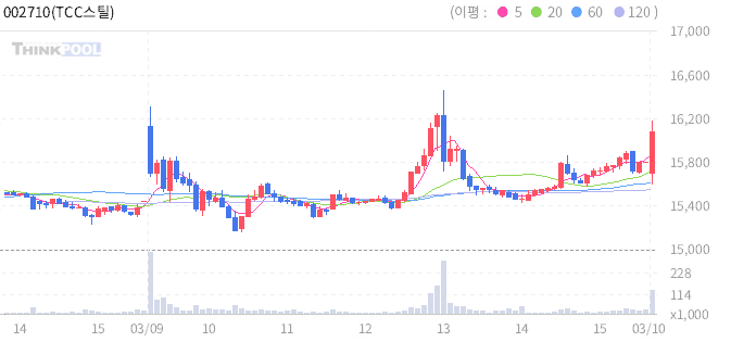 [클릭 e종목] “TCC스틸, 2차전지 소재 독점 공급 수혜 전망”2023/03/09NH투자증권은 9일 TCC스틸에 대해 2차전지 관련 시설 투자 규모 확대로 실적 상승이 기대된다고 평가했다. TCC스틸은 표면처리강판 전문 제조기업으로 식음료와 산업 포장 용기와 전자제품 등에 쓰이는 주석도금강판...