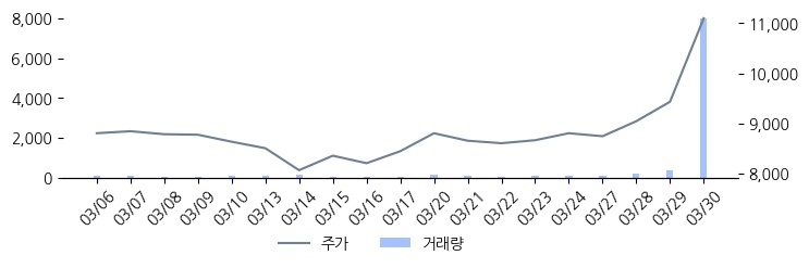 20일 평균 거래량 대비 거래량이 급증한 종목입니다. 최근 주가의 움직임과 주요 매매주체의 변동을 함께 확인해야 합니다. 03/30 15:35 기준